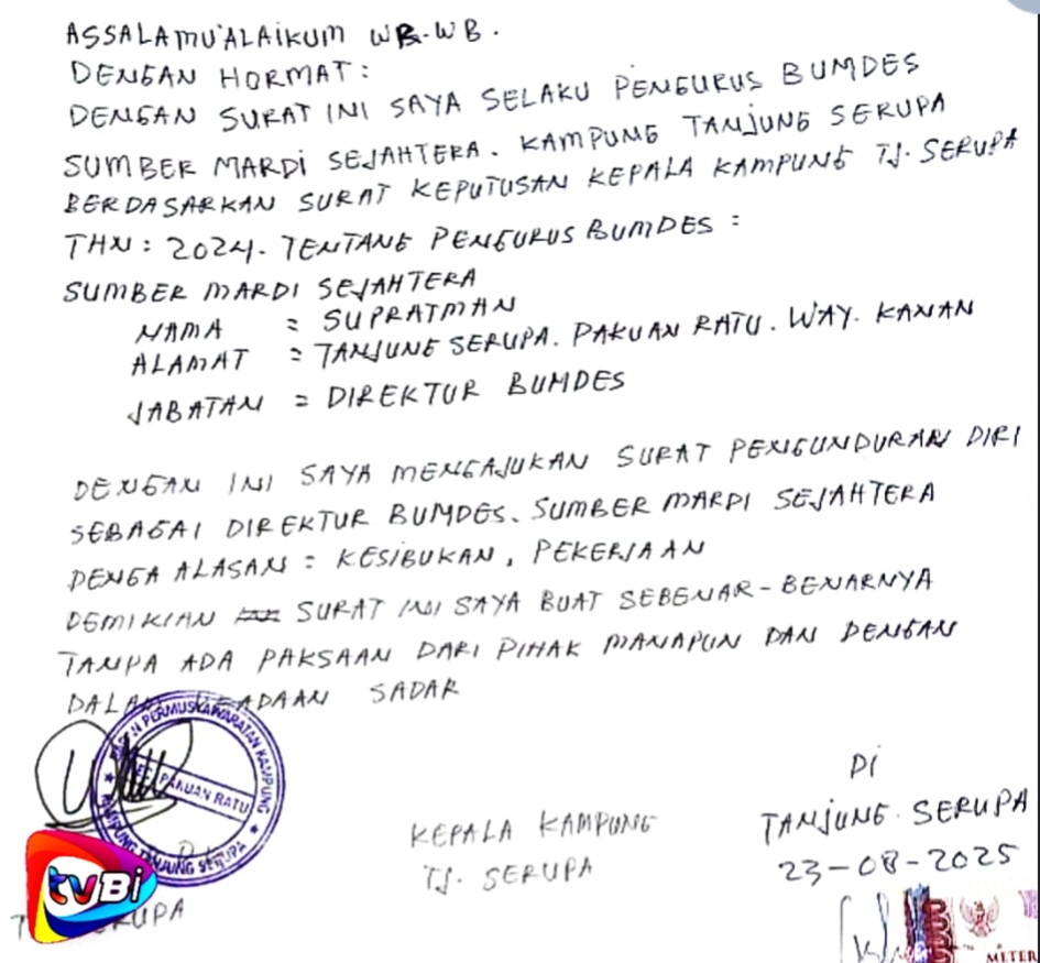 WAY KANAN (Senin, 2/11/2025) | Direktur Beserta Beberapa Anggota Badan Usaha Milik Desa (BUMDES) Sumber Mardi Sejahtera Kampung Tanjung Serupa Kecamatan Pakuan Ratu Mengundurkan Diri Secara Masak Diduga Karna Anggaran lenyap tak jelas.