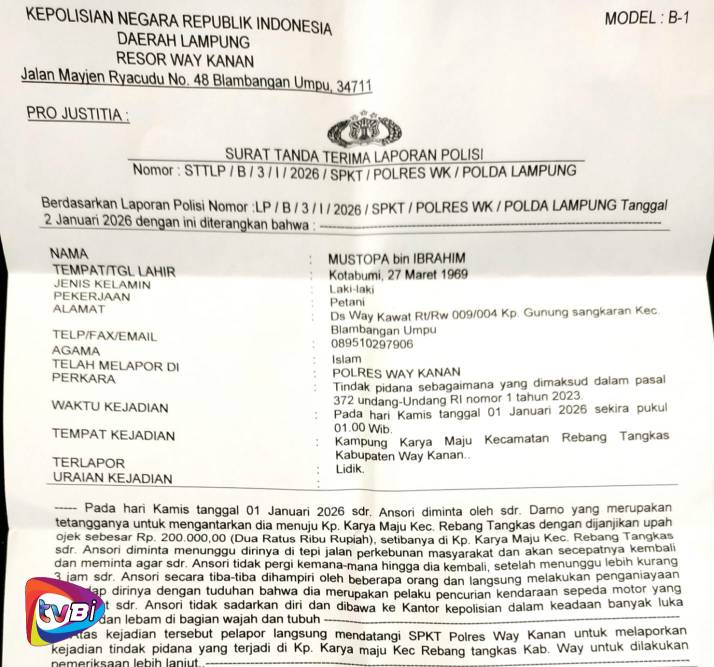 Lebih lanjut darlin menyatakan, laporan resmi di polres way kanan dengan No. LP/B/3/1 /2026/SPKT/POLRES. Polda Lampung tanggal 2 Januari 2026 telah diterima pihak penyidik polres way kanan setempat.
