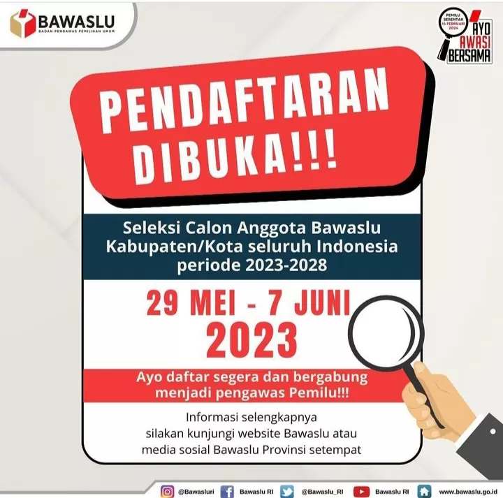 Pembukaan pendaftaran seleksi calon anggota Bawaslu Kabupaten/Kota ini terhitung mulai 29 Mei hingga 7 Juni 2023.