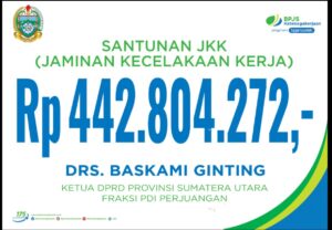 “Atas nama pemerintah, kami sampai dukacita mendalam, kami serahkan santunan kematian BPJS Ketenagakerjaan, semoga Tuhan Yang Maha Kuasa memberikan penghiburan, ” ungkap Pj Gubsu kepada isteri almarhum didampingi keluarga sembari menyerahkan santunan secara simbolis pada acara penghormatan mendiang Ketua DPRD Sumut Baskami Ginting di Gedung Paripurna DPRD Sumut, Jalan Imam Bonjol Medan, Sabtu (10/2).