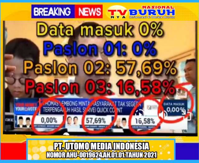 “Data masih 0 persen tetapi quickcount utk @prabowo sudah 57,69 persen dan @ganjarpranowo 16,58 persen. Sementara @aniesbaswedan ya harus 0 persen, harus kalah..
