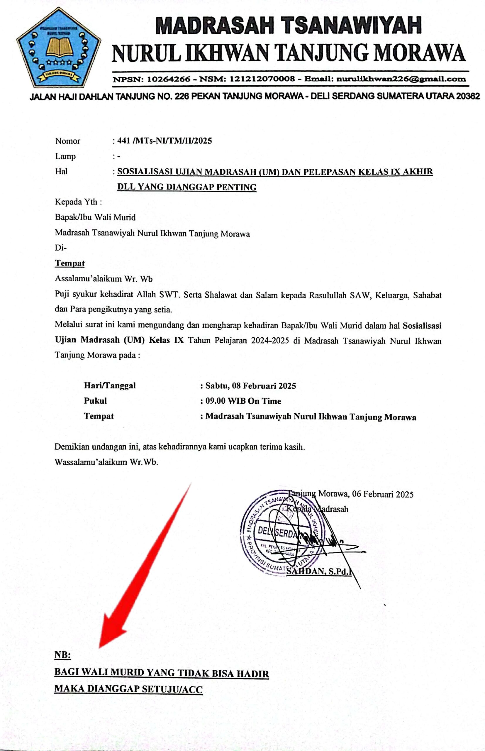 Sahdan, S.Pd.I sebagai kepala sekolah swasta YP Mts Nurul Ikhwan Tanjung Morawa ketika ditanyai Reporter Tvnyaburuh Rabu, 23/4/2025 mengatakan “Sebelumnya kami sudah berikan undangan rapat sosialisasi kepada orang tua wali murid, guna orang tua wali murid di undang kesekolah untuk membahas administrasi ujian madrasah, bulanan sekolah dan administrasi pelepasan siswa siswi dibulan mei.” Ujarnya