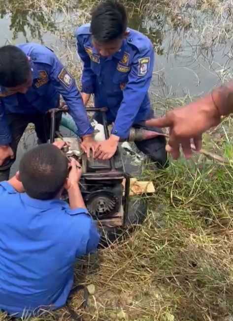 Beberapa petugas memperbaiki mesin sedot air.foto