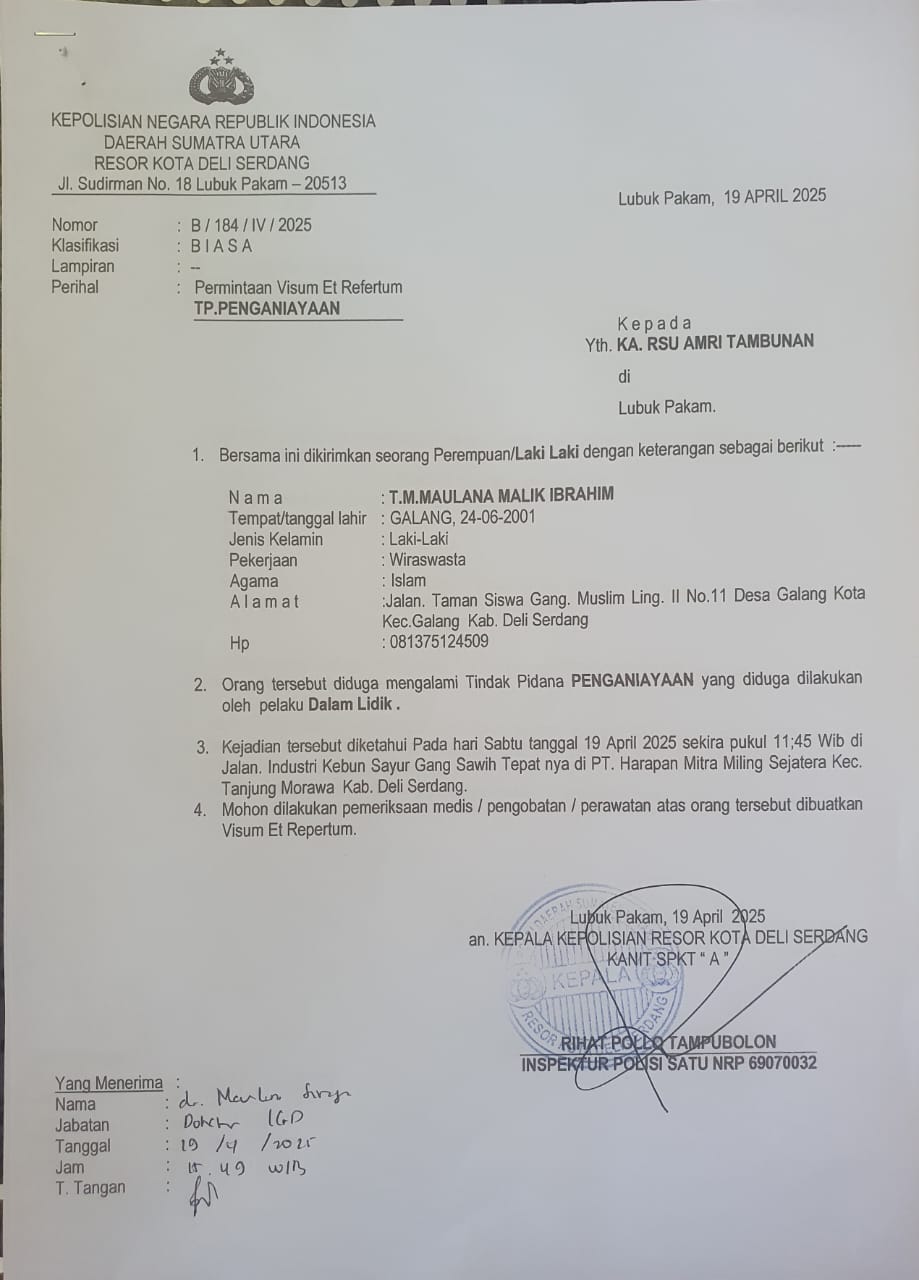 “Saya dan rekan saya dianiaya saat bertugas. Dan, persoalan ini sudah dilaporkan ke Polresta Deli Serdang”, ujar Maulana Ibrahim Malik kepada wartawan Minggu (20/4) pagi.