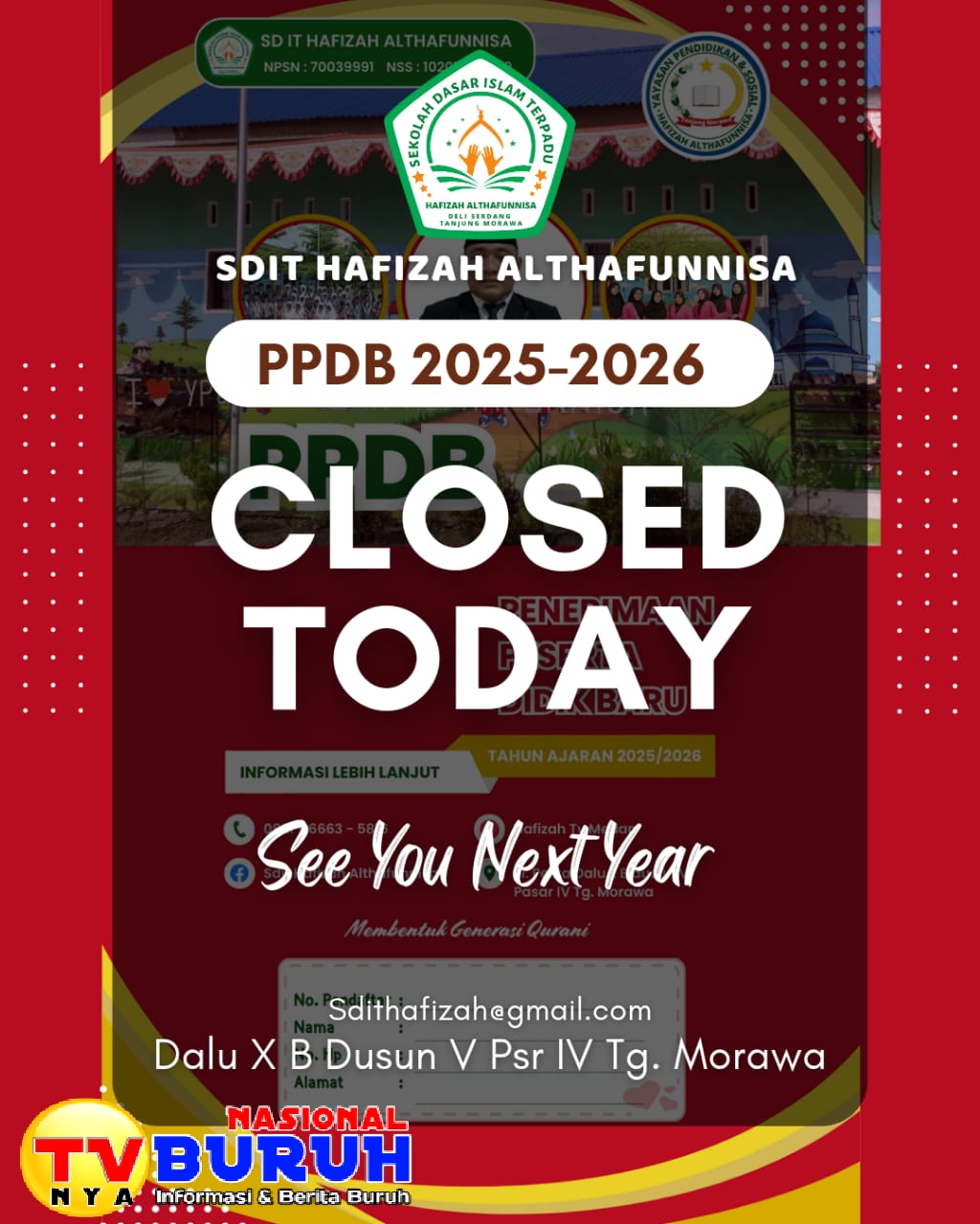 DELI SERDANG| (Sabtu, 8/3/2025) PPDB adalah singkatan dari Penerimaan Peserta Didik Baru. merupakan kegiatan rutin yang dilaksanakan setiap tahun oleh sekolah SD IT HAFIZAH ALTHAFUNNISA untuk menerima siswa baru. Namun Penerimaan Peserta Didik Baru (PPDB) Tahun ini Sangat Berbeda jika Di Banding kan Dengan Tahun Sebelumnya, Kalau Tahun Sebelumnya Ketika Seminggu lagi Sebelum memasuki Tahun Ajaran Baru Di Situ Lah Baru Di tutup Pendaftaran Penerimaan Peserta Didik Baru (PPDB).