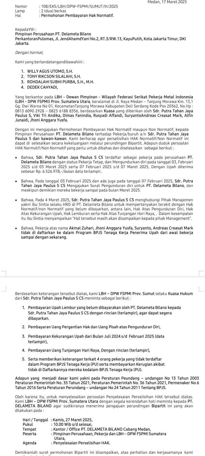 Diberitahukan, persoalan ketenagakerjaan yang melibatkan Ex Karyawan dengan PT. Delameta Bilano kini masuk kerana perselisihan hubungan industrial yang di kuasa hukumkan Putra Tahan dan CS kepada Lembaga Bantuan Hukum Dewan Pimpinan Wilayah Federasi Serikat Pekerja Metal Indonesia (LBH DPW FSPMI) Provinsi Sumatera Utara.