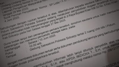 Ketiganya dipanggil untuk hadir di Polresta Sidoarjo tanggal 9 dan 10 Juni 2025.