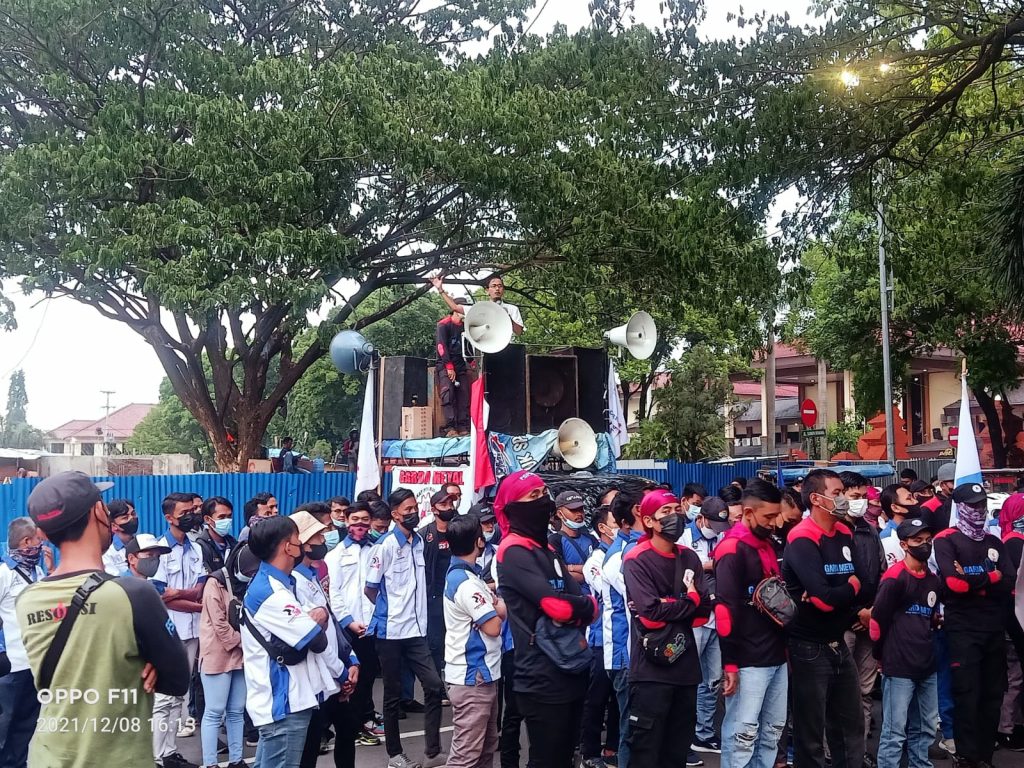 CIREBON | Tvnyaburuh.com – Ratusan buruh yang tergabung dalam serikat pekerja Federasi Serikat Pekerja Metal Indonesia (FSPMI) Cirebon datangi kantor walikota dan bupati Cirebon sampaikan aspirasi yakni tuntut upah layak tahun 2022, Rabu (8/12/2021).