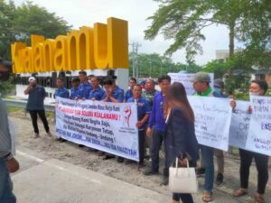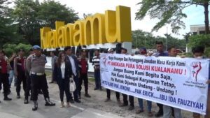 DELI SERDANG | Sebanyak 20 orang eks pekerja PT Angkasa Pura Solusi (APS). anak perusahaan dari PT Angkasa Pura II melakukan aksi unjukrasa di depan pintu gerbang keluar Bandara Kualanamu, Jumat (26/5/2023), sekira pukul 10:00 Wib.