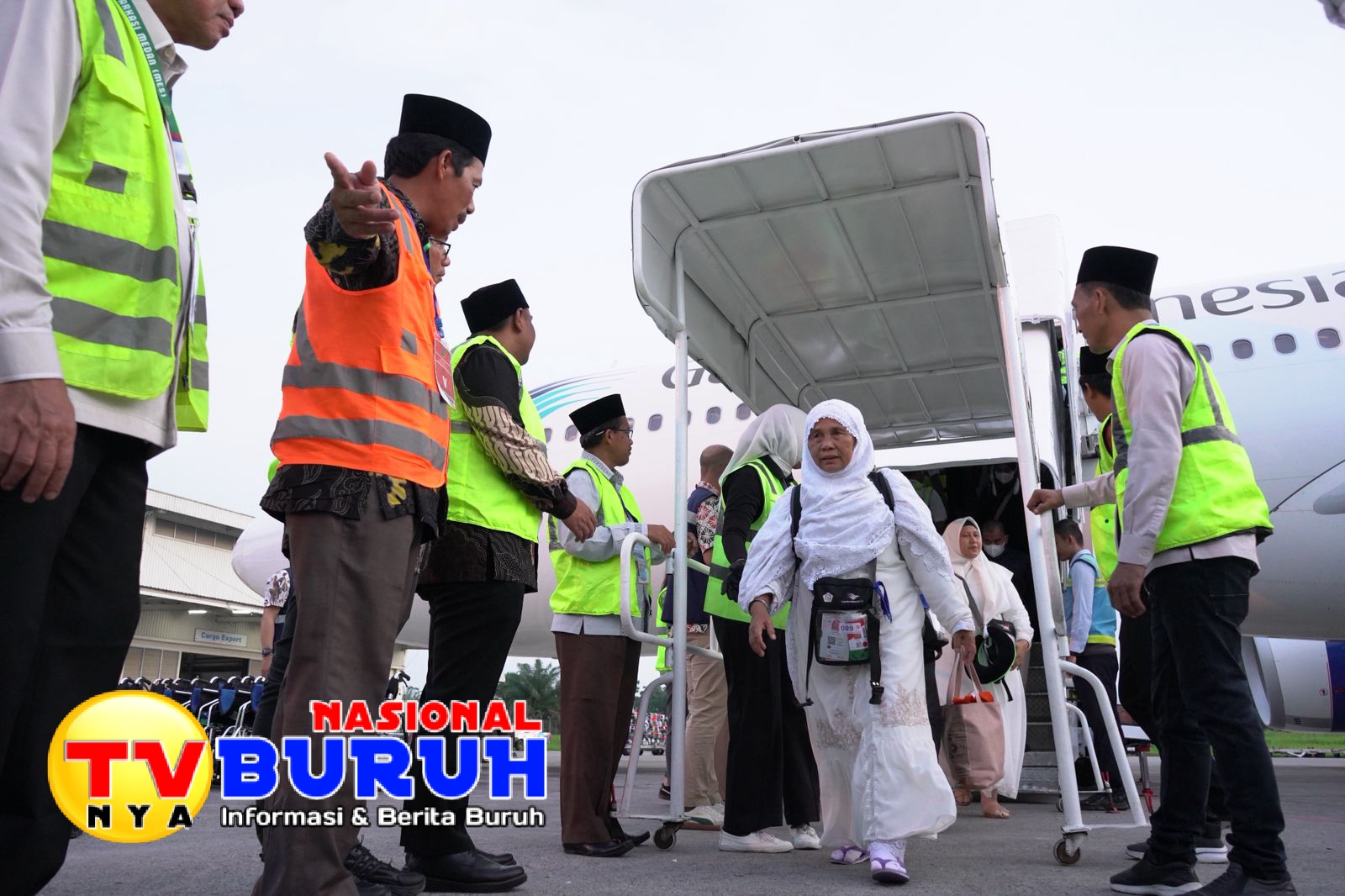 MEDAN | Jemaah haji yang tergabung dalam Kelompok Terbang (Kloter) 1 Debarkasi Medan asal Kota Padangsidimpuan tiba di tanah air pada Kamis (12/6/2025). Kloter 1 tiba dengan Pesawat Garuda Indonesia dengan nomor penerbangan GIA 3401 di Bandara Internasional Kualanamu Deli Serdang pukul 18.00 WIB.
