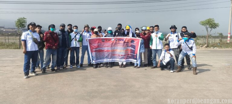 Para peserta tampak kompak mengenakan atribut organisasi, membawa spanduk besar berisi tuntutan perjuangan, serta mengacungkan tangan sebagai simbol solidaritas kelas pekerja.
