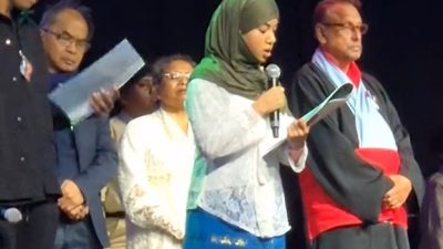 Yang pertama teks proklamasi ini dibacakan dengan bahasa Indonesia oleh Aisha Hanafi – Patty dengan pakaian berwarna putih biru mengenakan penutup kepala warna hijau (Jilbab).