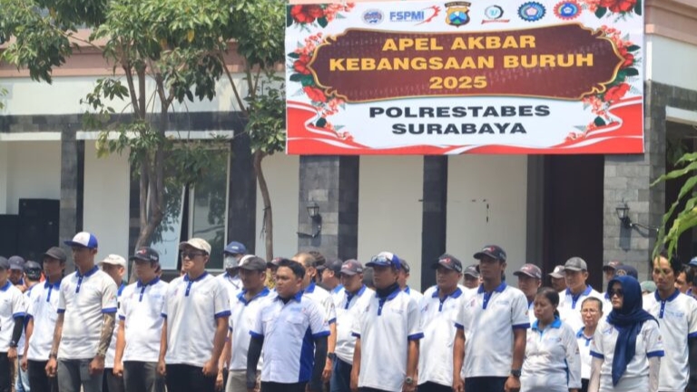 SURABAYA | TVNYABURUH, – Dalam rangka memperkuat sinergi antara Kepolisian Republik Indonesia (Polri) dan Serikat Pekerja/Serikat Buruh, Federasi Serikat Pekerja Metal Indonesia (FSPMI) Kota Surabaya menghadiri undangan Polrestabes Surabaya dalam agenda “Apel Kebangsaan Serikat Pekerja/ Serikat Buruh”. Kegiatan ini diselenggarakan pada Kamis, 23 Oktober 2025 di halaman Mapolrestabes Kota Surabaya, sebagai bentuk dukungan terhadap terciptanya situasi Kamtibmas yang kondusif di Kota Surabaya.